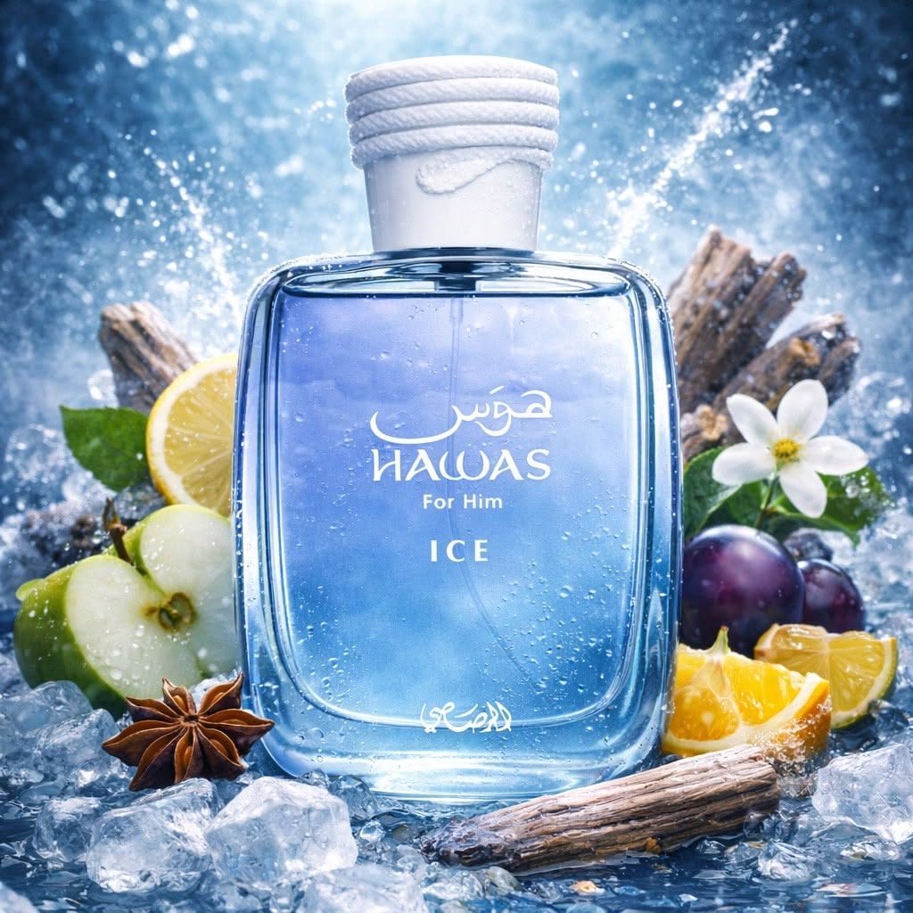 Hawas Ice de Rasasi est une eau de parfum masculine, fraîche et moderne, avec une ouverture fruitée et citronnée très énergique. La pomme, le citron d’Italie, la bergamote de Sicile et la badiane apportent un départ vif et lumineux. Le cœur mêle prune, fleur d’oranger et cardamome, avant de laisser place à un fond élégant de musc, ambre, bois flotté et mousse.